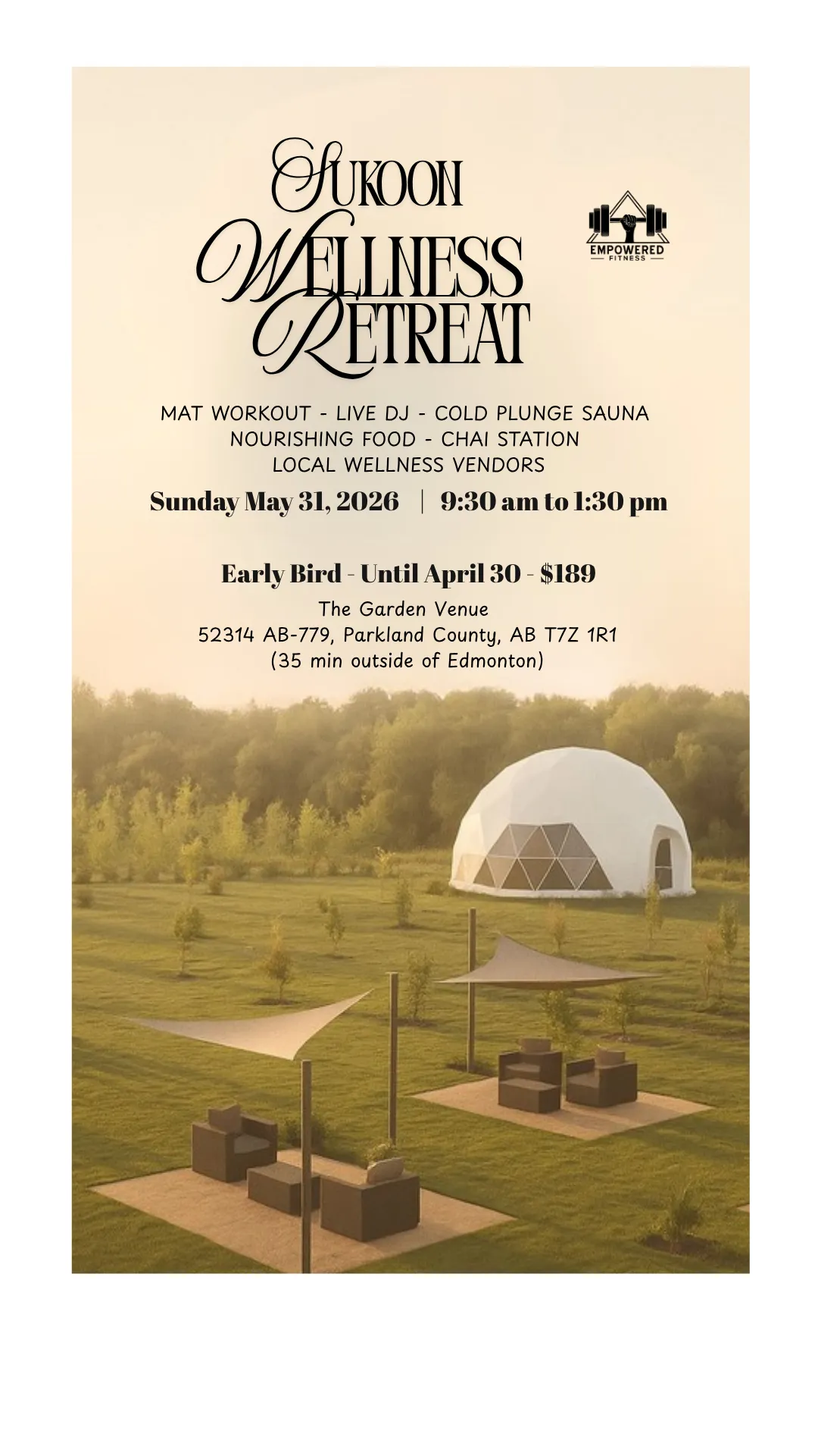 Set in the serene beauty of The Garden Venue (35 minutes outside of Edmonton, Alberta), surrounded by trees, flowers, and open skies, this curated wellness experience blends movement, mindfulness, and warmth into one unforgettable morning.